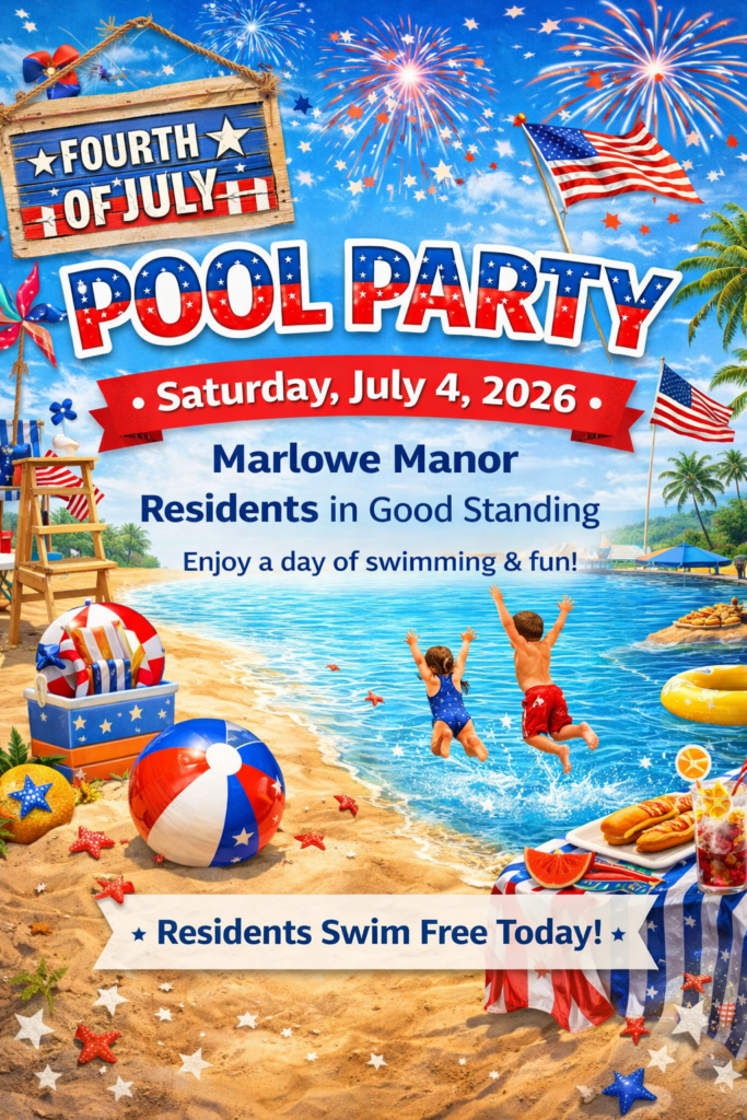 Join the community on Saturday, July 4, 2026, for a fun day of swimming, sunshine, and neighborhood fellowship at the Marlowe Manor Pool. This special holiday gathering is a great opportunity to cool off, spend time with friends and neighbors, and celebrate the Fourth of July together.